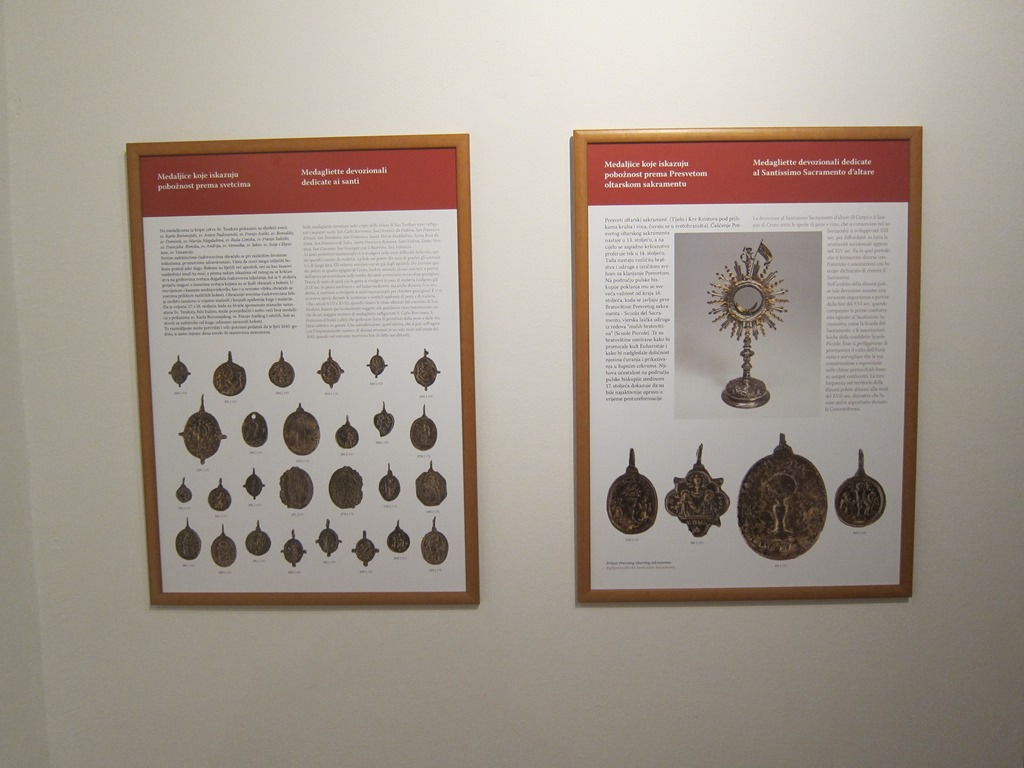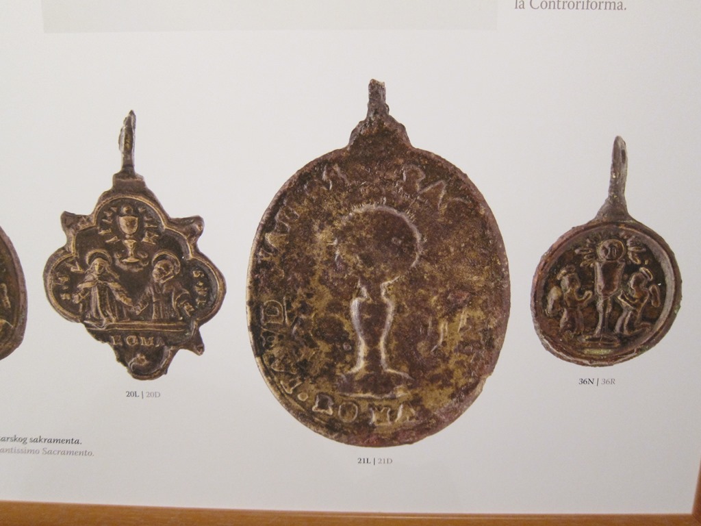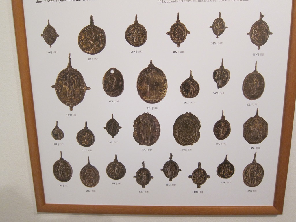 The exhibition shows medals of saints found during research into the Benedictine Convent and Church of St Theodore in Pula. These are pendants with relief depictions on both sides, mostly with the figures of Jesus, the Virgin, the saints, miraculous images and objects and pilgrimage sites. The believers wore them hanging from rosaries and around their necks, as symbols of faith, protection and consolation. Even in their deaths, the deceased were not parted from these expressions of the profundity of their piety. They were made in pilgrimage sites, in monasteries, and the highest quality among them probably in the mints of Rome. They are dated to the 17th and 18th centuries. Today these objects have value from the point of view of cultural studies and are objects not to be ignored in studies of the complexity of living in a given area.