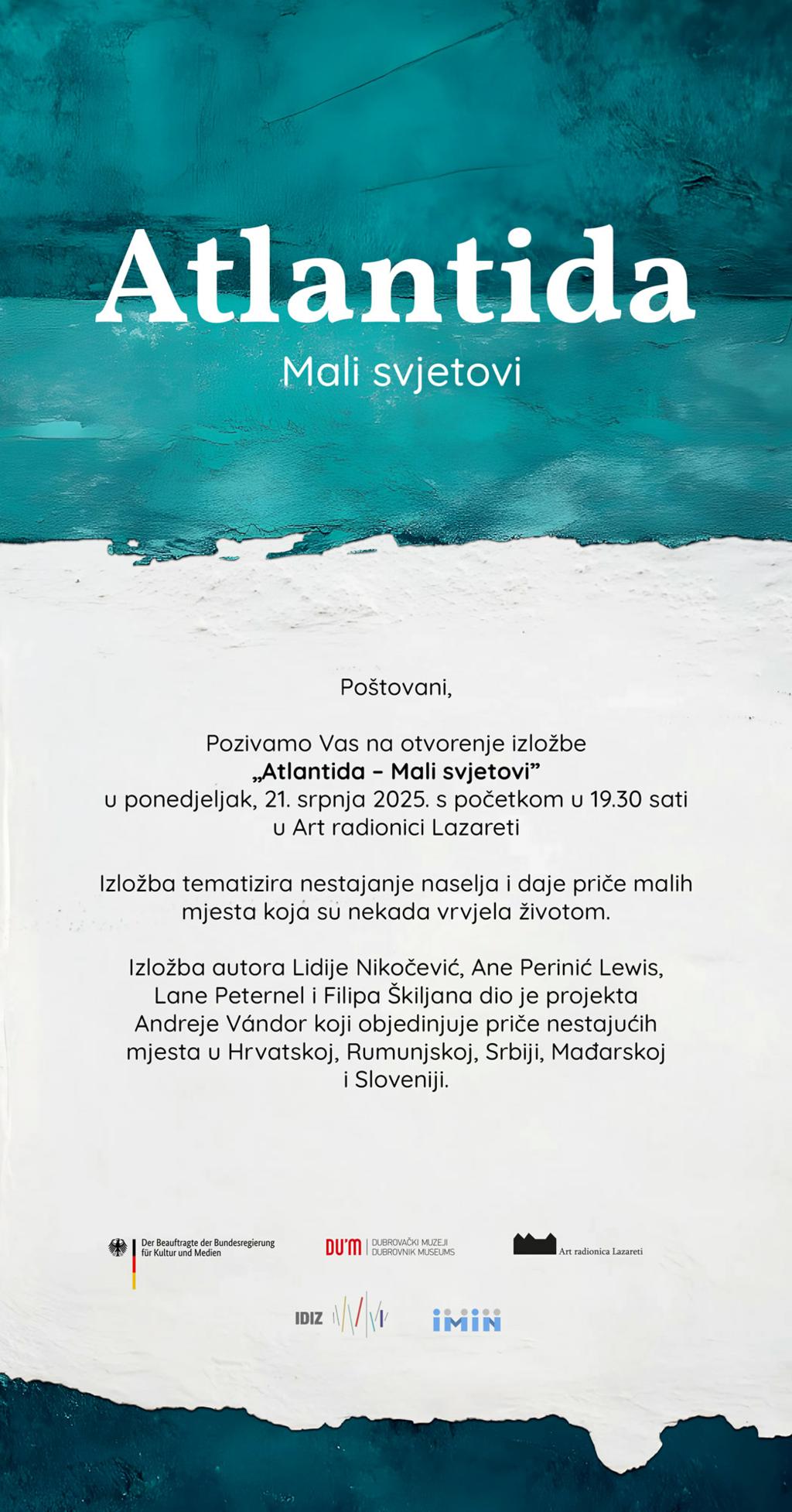 Dubrovački muzeji u ponedjeljak 21. srpnja 2025. u 19.30 sati u izložbenom prostoru Art radionice Lazareti, otvoriti će gostujuću izložbu Muzeja europskih kultura u Berlinu, „Atlantida – Mali svjetovi“, koja donosi priče o nestalim i nestajućim mjestima u Europi.